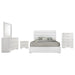 Upgrade your bedroom with this ultra-modern platform bed and matching case pieces. The bed features a sleek white faux leather upholstery with horizontal channel tufting, while its low-profile design enhances the contemporary aesthetic. Case pieces are finished in a polished white high-gloss polyurethane for a clean, sophisticated look. Polished chrome metal bar handles provide a sleek contrast, while spacious drawers with felt-lined top sections offer both style and functionality.